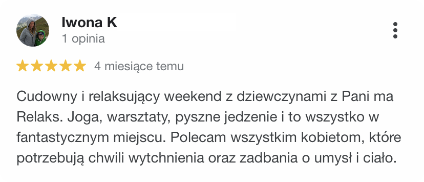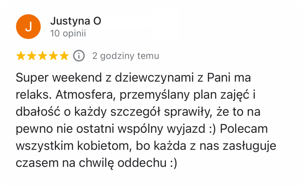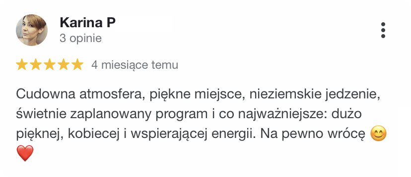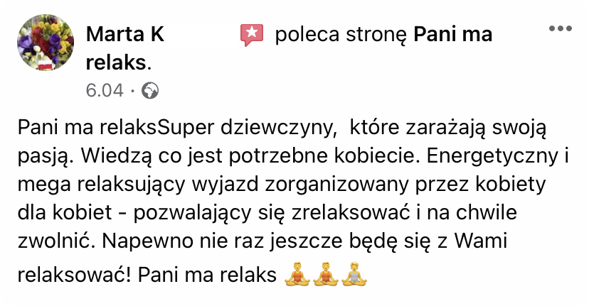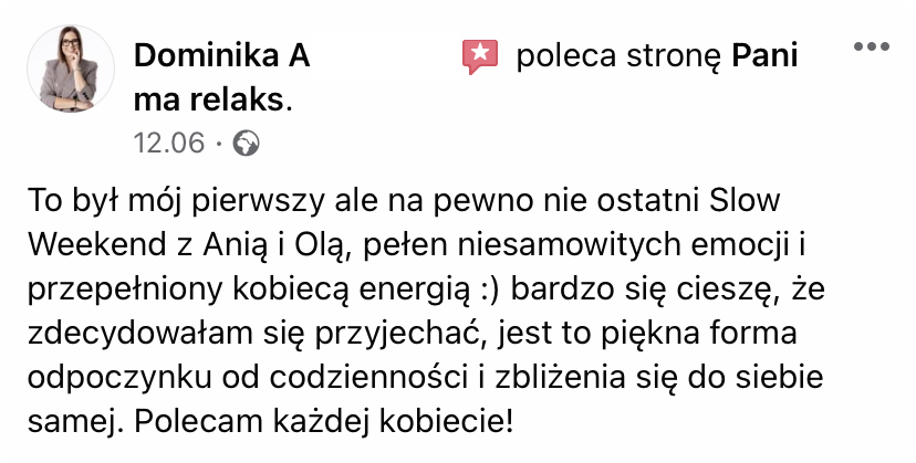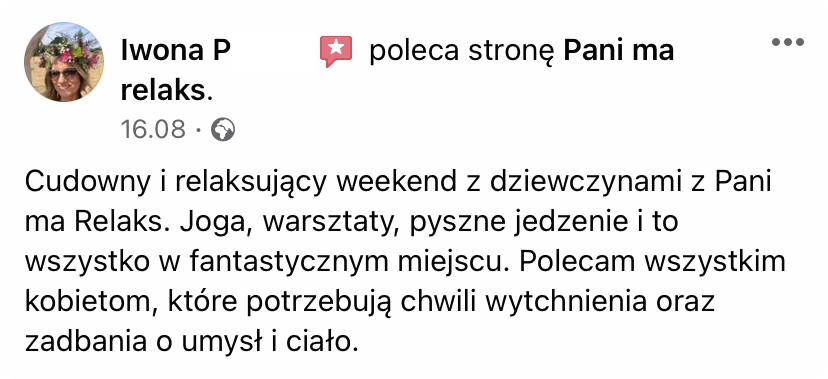 Wierzymy, że piękne doświadczenia niosą niepoliczalnie większą wartość, niż najpiękniejsze przedmioty. I że jednym z najwspanialszych prezentów, jakie można sprawić bliskiej osobie, to podarować jej czas, miejsce i okoliczności, w których może się zrelaksować i zadbać o swoje potrzeby. Sprezentuj swojej ulubionej kobiecie – mamie, córce, żonie, siostrze, dziewczynie, przyjaciółce – relaksujący wyjazd lub warsztaty (lub podpowiedz swoim bliskim, że właśnie taki prezent najbardziej by Cię ucieszył).